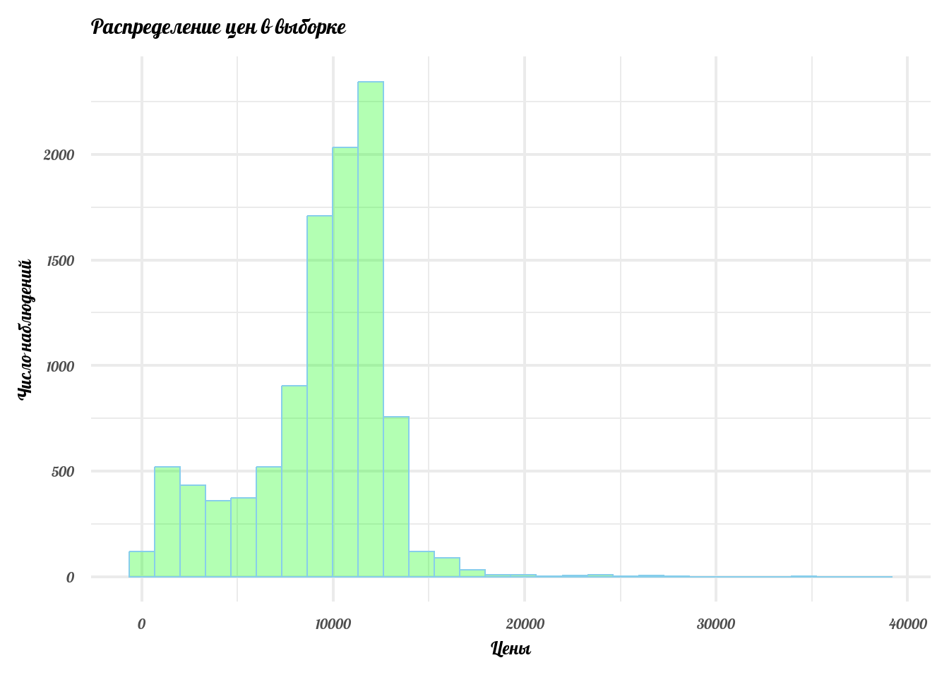 labs(x = 'Цены', y = 'Число наблюдений', title = 'Распределение цен в выборке')
