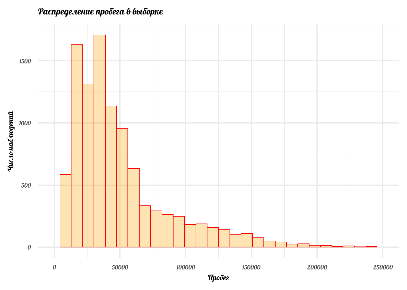 labs(x = 'Пробег', y = 'Число наблюдений', title = 'Распределение пробега в выборке')